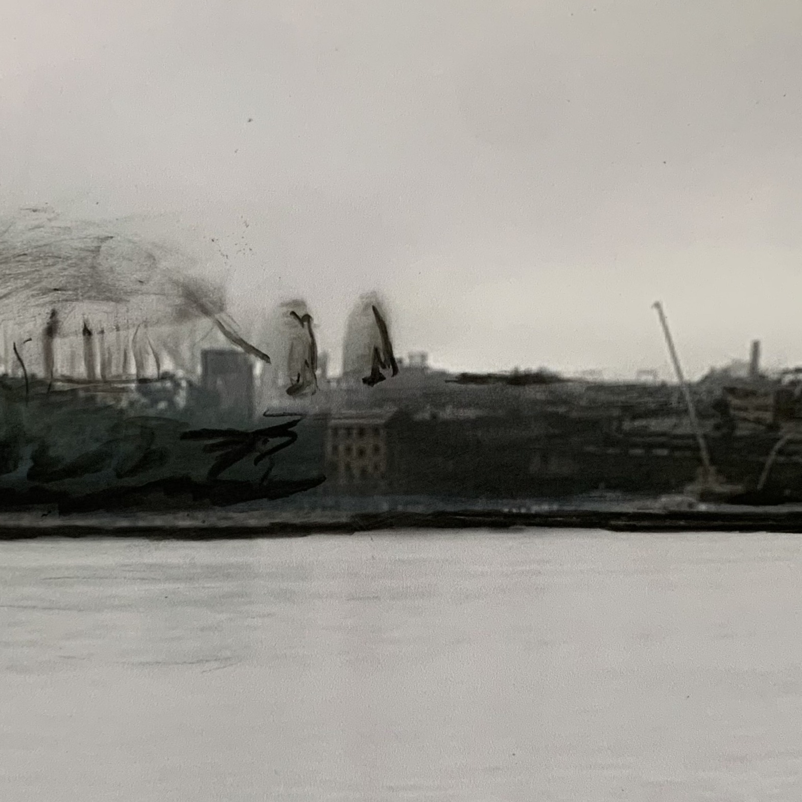 Australian icon the Sydney Harbour Bridge redrawn, reimagined. While it is part of a dark city skyline, as is true in our city lives and in within our very bodies, water is the largest and most important part.